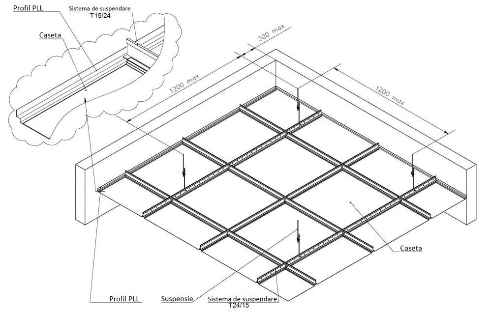 Tavanele casetate sunt compuse dintr-un sistem de suporturi (tije) fixate de tavan. La rândul lor, de tije sunt fixate ghidajele (longitudinale și transversale), care formează celulele carcasei de susținere și asigură rigiditatea întregii construcții. Casetele decorative din aluminiu se instalează în celulele carcasei.