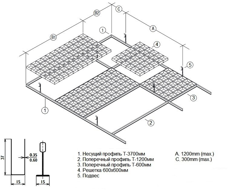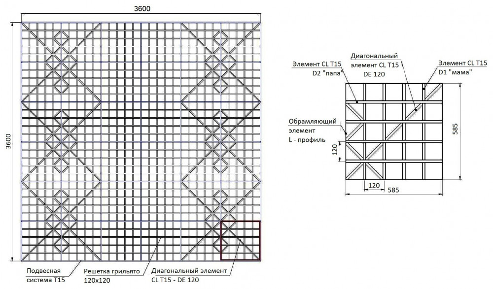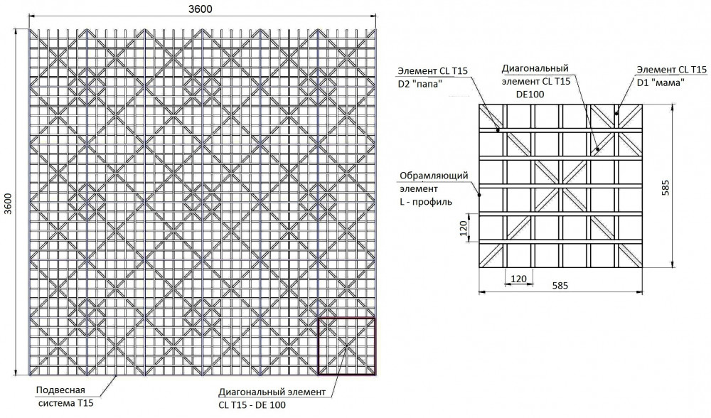 Cистема Дизайнерских потолков грильято CL-T15 состоит из отдельных объемных решеток, диагональных элементов и подвесной системы «Т-профиль» шириной 15 мм. Объемные решетки образованны пересекающимися U-образными профилями и диагональными элементами. По периметру решетка обрамлена L-образными профилями. Каждая отдельная решетка легко вставляется в стандартную ячейку подвесной системы Т-15. По завершению установки решеток на подвесную систему трудно визуально отличить Т-профили подвесной системы от U-образхных профилей Грильято, т.е. поверхность производит впечатление сплошной (непрерывной) конструкции.