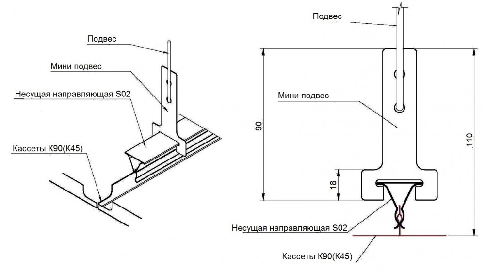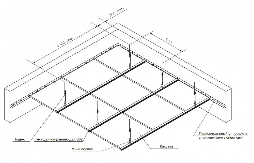 Кассетные потолки состоят из системы кронштейнов (подвесов), прикрепленных к перекрытию. В свою очередь, к подвесам крепятся направляющие (стрингеры), обеспечивающие жесткость всей конструкции.