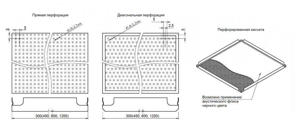 Для того чтобы обеспечить оптимальный акустический контроль в помещениях, кассеты могут быть перфорированными. В качестве стандартной функции, перфорированные кассеты снабжены звукопоглощающим нетканым материалом наклеенным на внутренней поверхности кассеты.